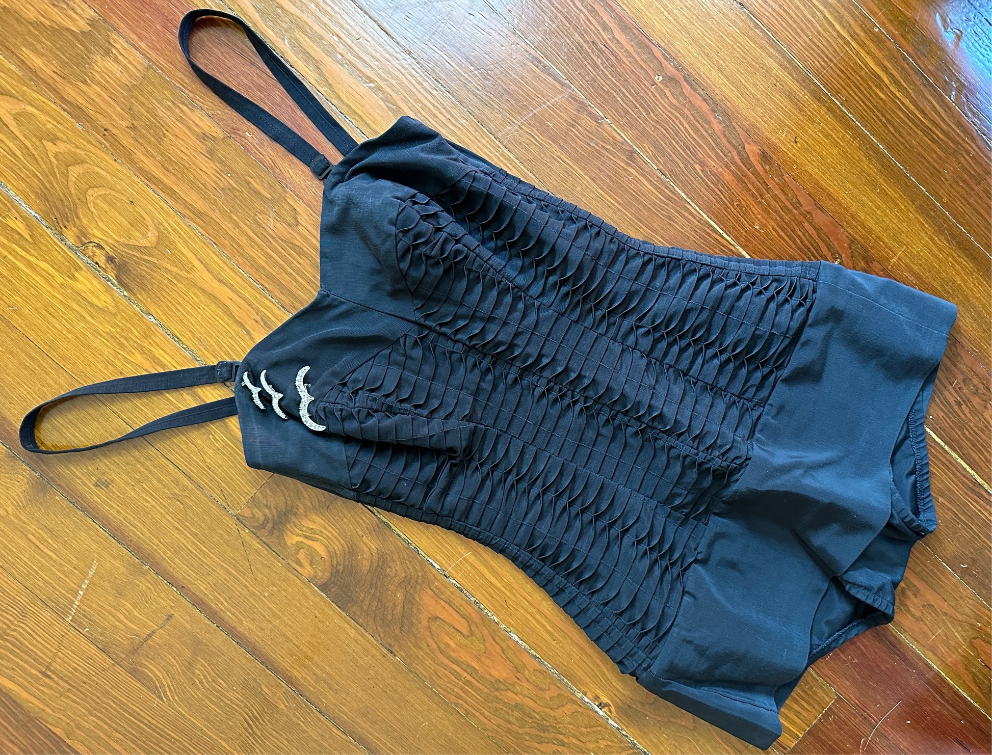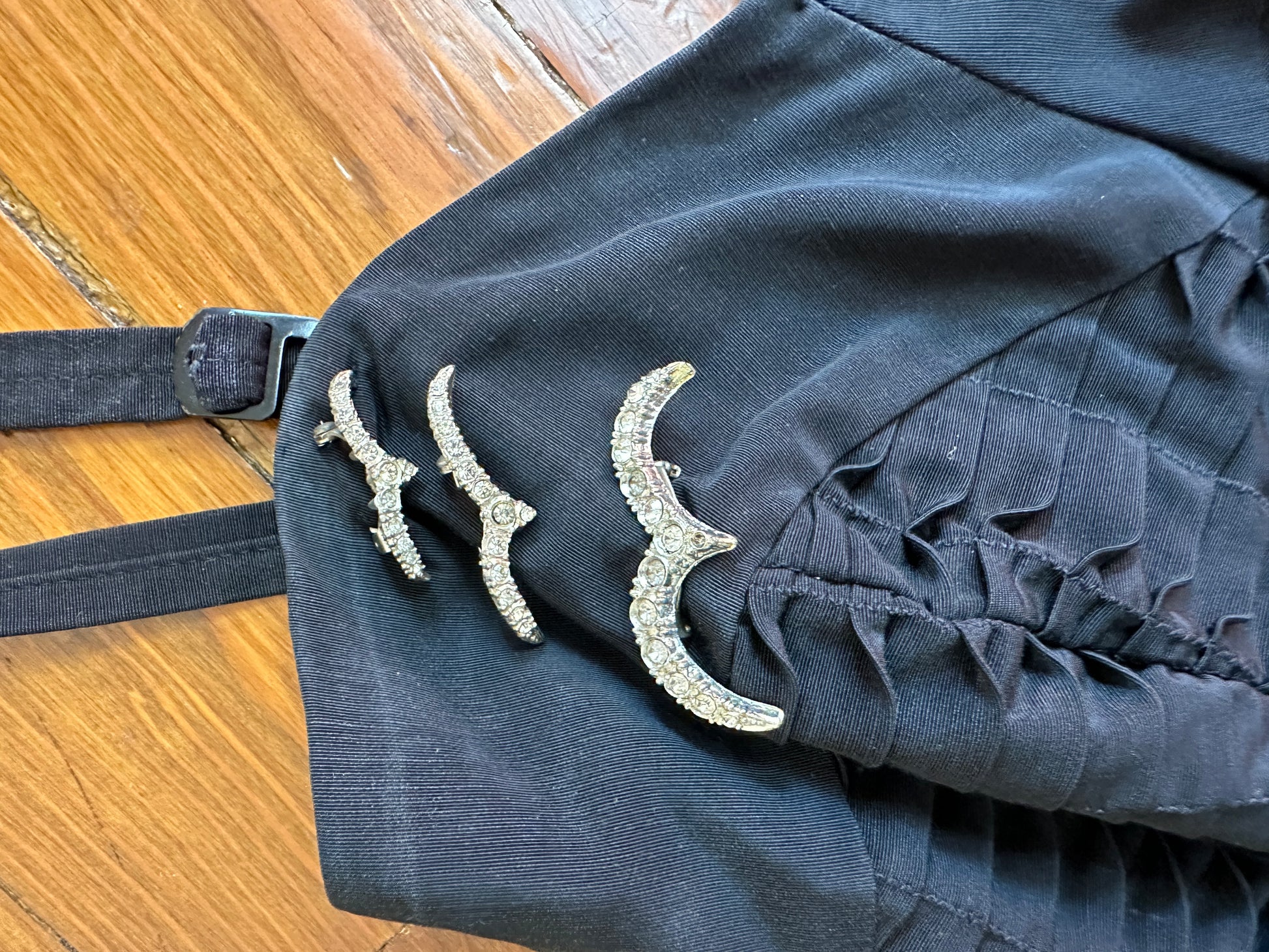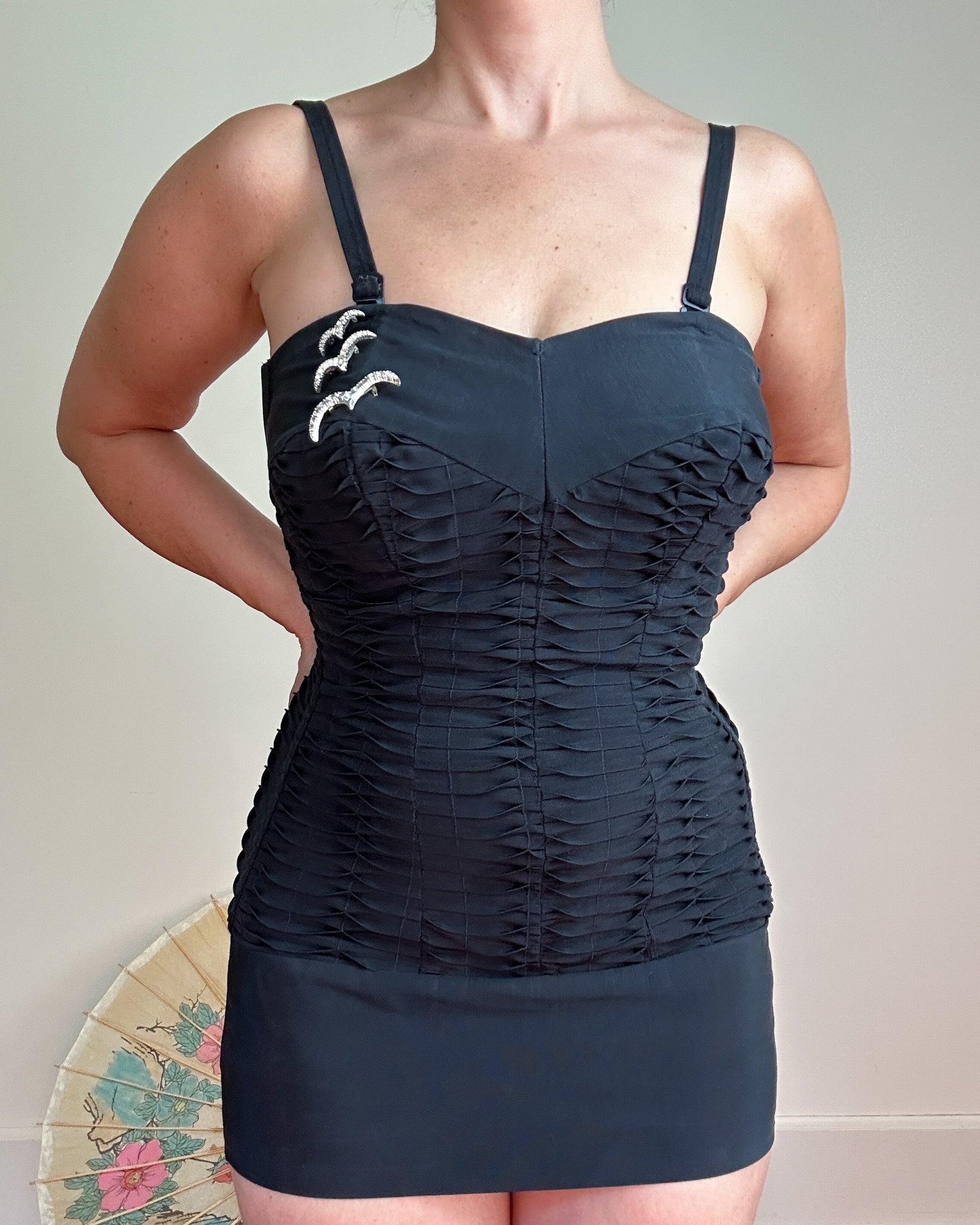 Incredibly rare 1950s Catalina Black Swimsuit; Instant Pinup. Ruched and boned at sides, rear metal zipper and detachable straps. Three rhinestone seagull pins, each one bigger than the next. Truly special, extrememly flattering, and absolutely wearable.