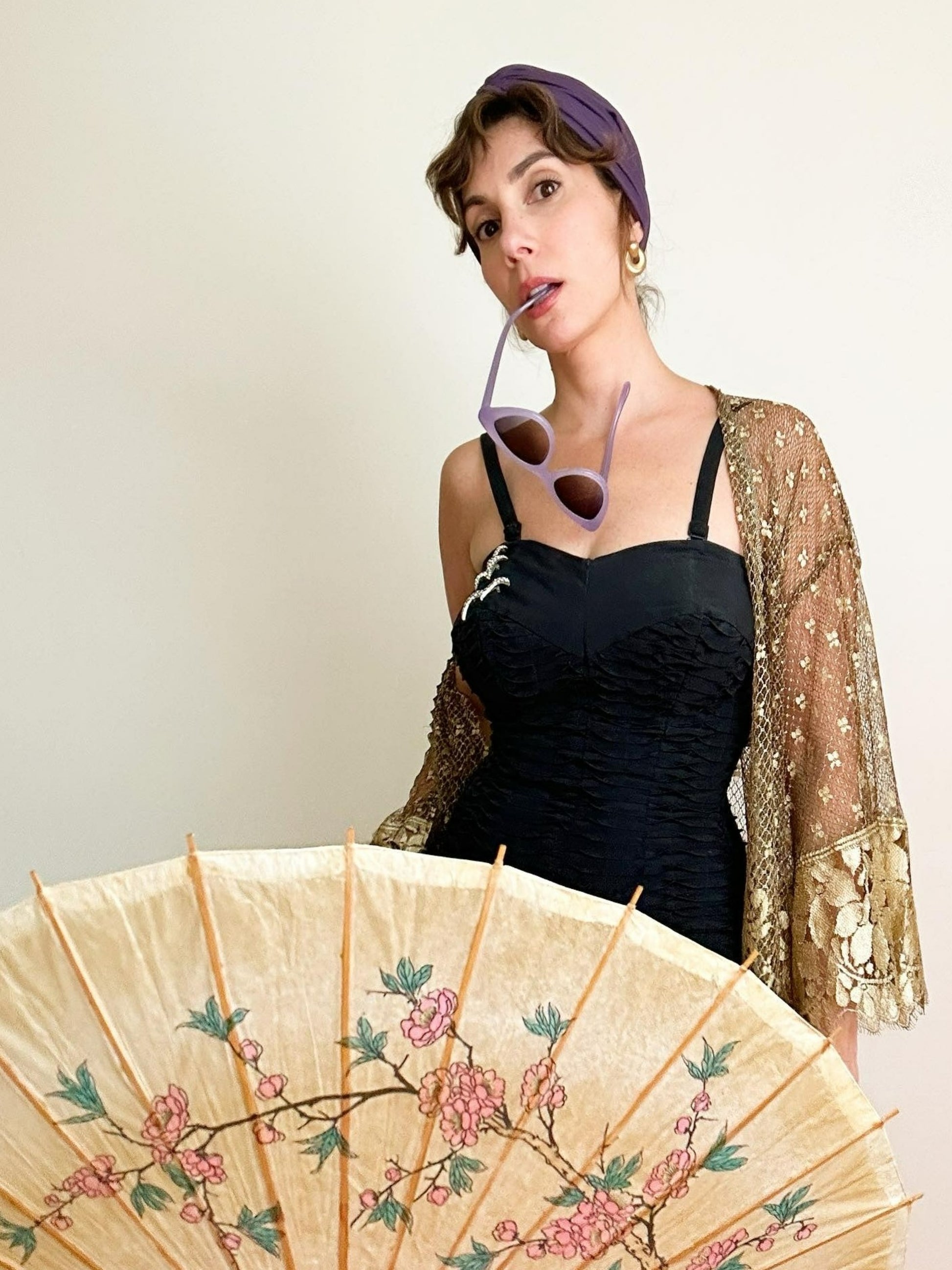 1950s Catalina Ruched Swimsuit with Rhinestone Seagull Pins