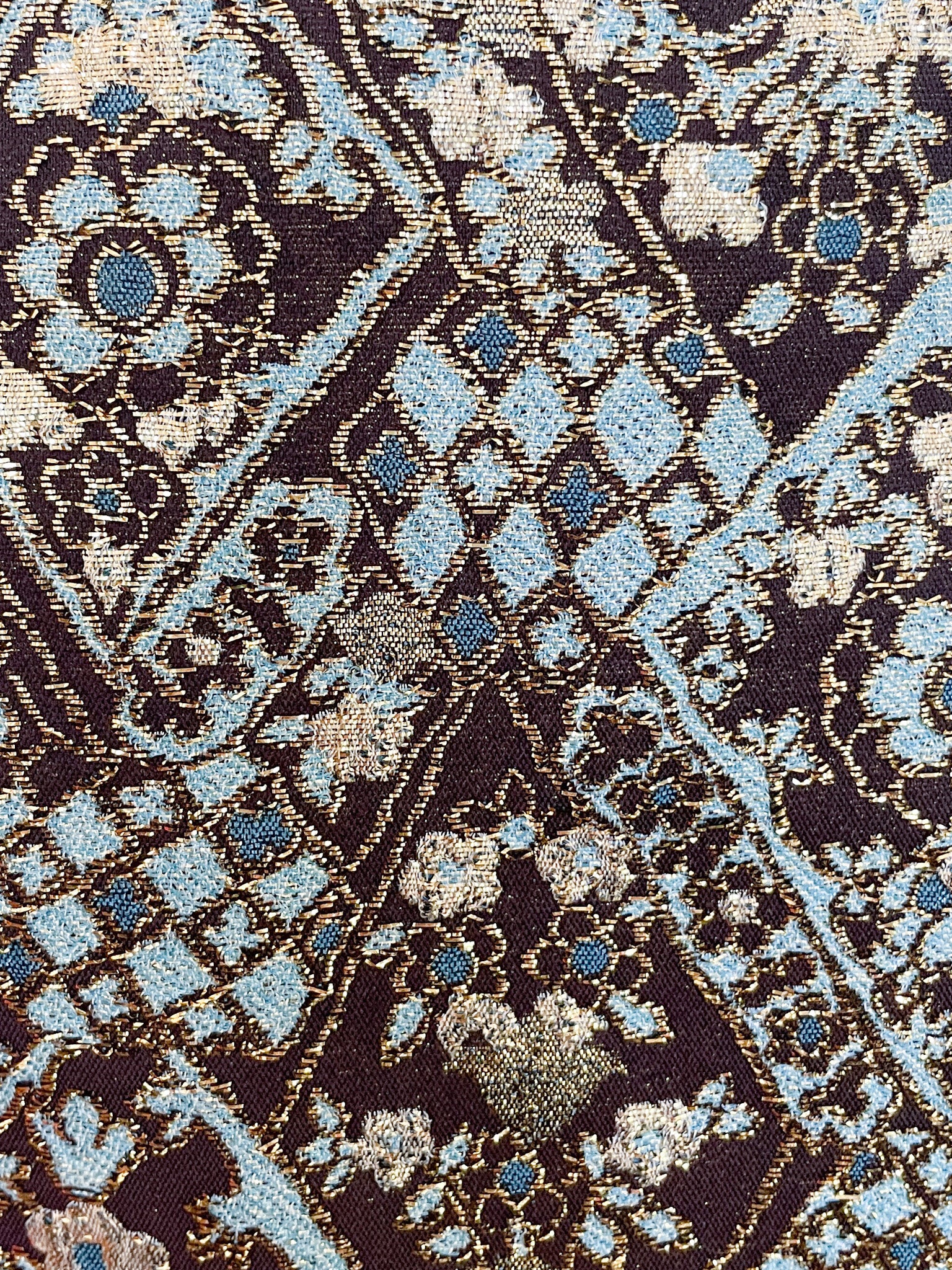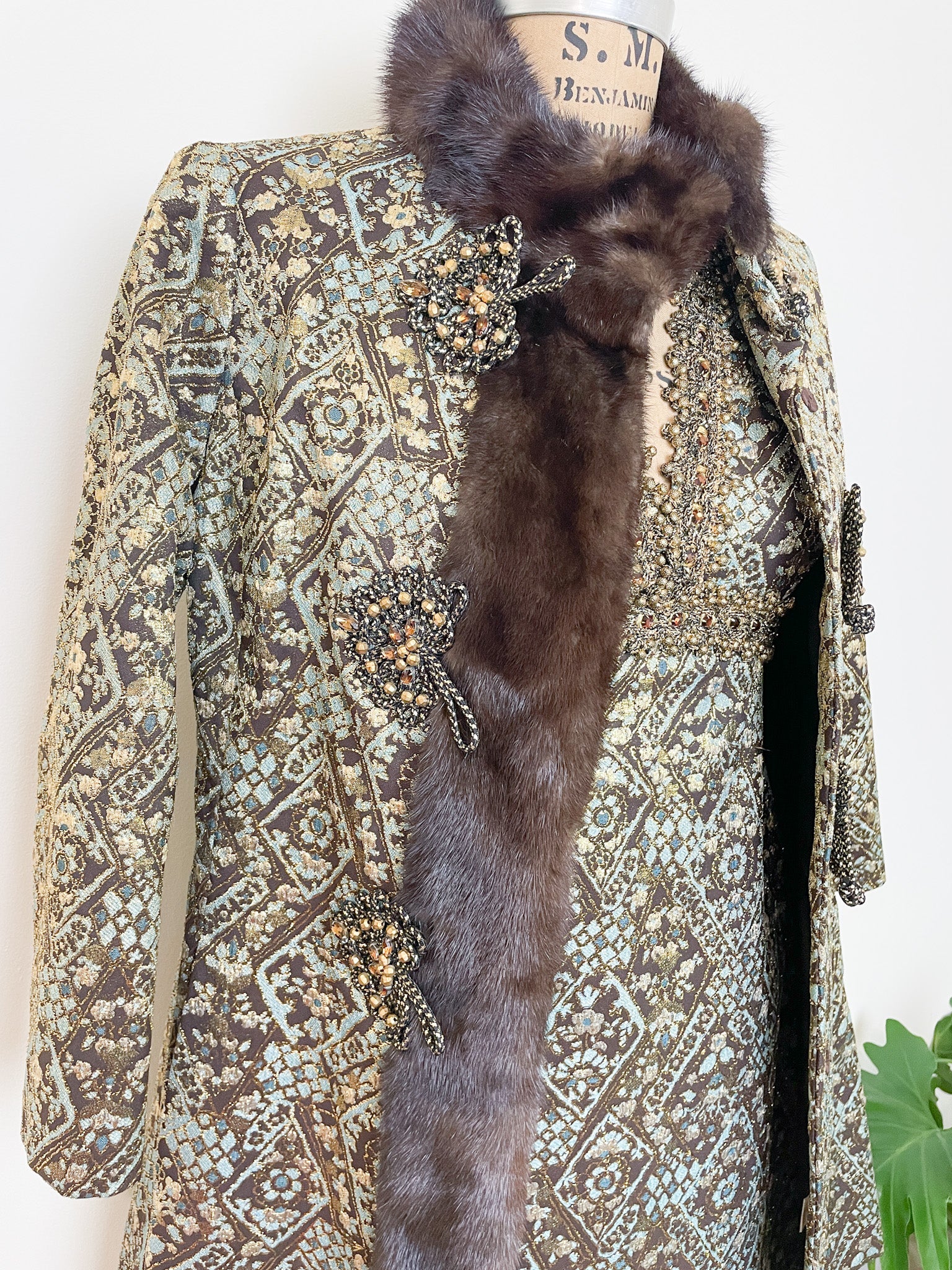 This ensemble is a stunning piece of fashion history, with gold metallic brocade in hues of Robin's egg blue, teal, and chocolate brown. The coat features a mink trimmed collar and right lapel, beaded frog closures along with snaps, and is fully lined in silk. The dress is a sleeveless shift of the same metallic brocade and has incredibly intricate embroidered and bejeweled trim that follows the v-neck bustline, goes under the bust at the empire waist and all the way around. The dress is lined with silk and features a hidden zipper and hook & eye closure in the rear.
