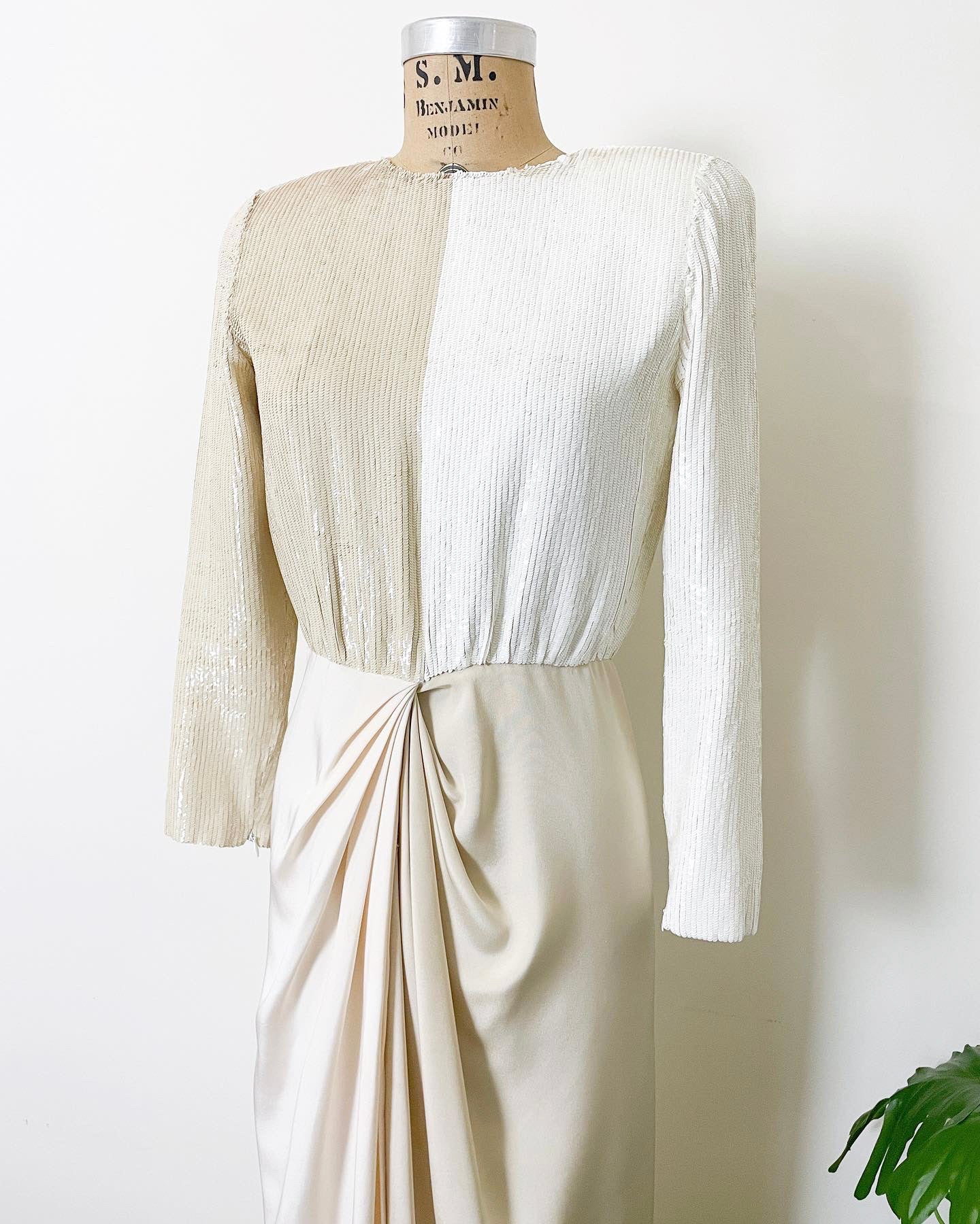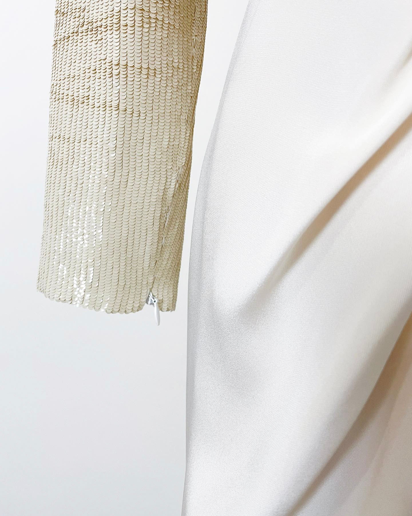 Get the ultimate demure wow factor with this late 1970s Bill Blass for Saks Fifth Avenue color block sequin gown. Featuring a long sleeved crew neck bodice with nude and white contrasting sequins, the placement and small size of the sequins gives a wet look in the chicest and most modern way. Each wrist has a zipper allowing you to wear a stack of bangles or go bare. The skirt is draped at the center of the waist and mimics the color blocking of the bodice in the opposite direction. Lightly padded in the shoulders with invisible zip, hook, and eye closure on the back. ILGWU tag.
