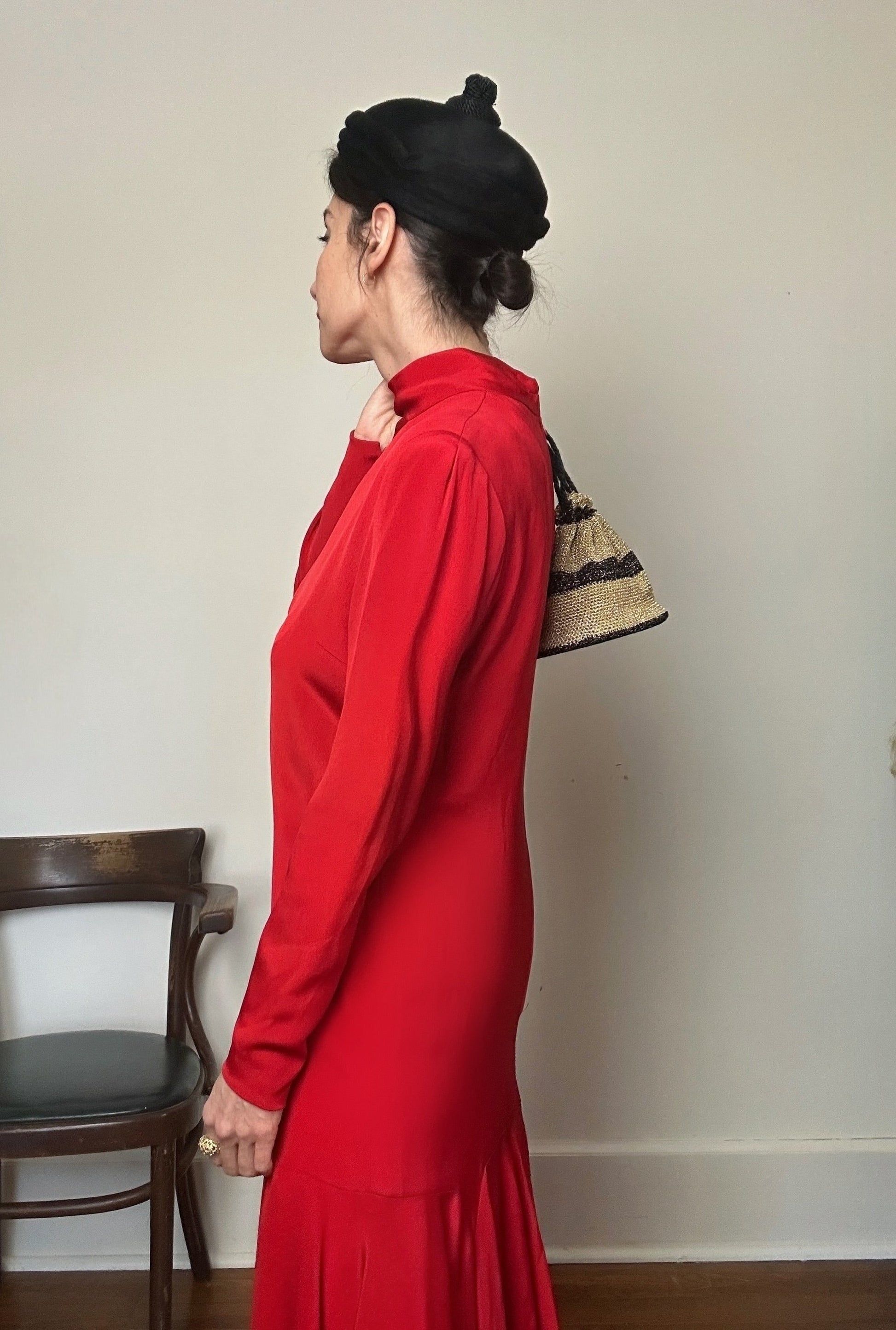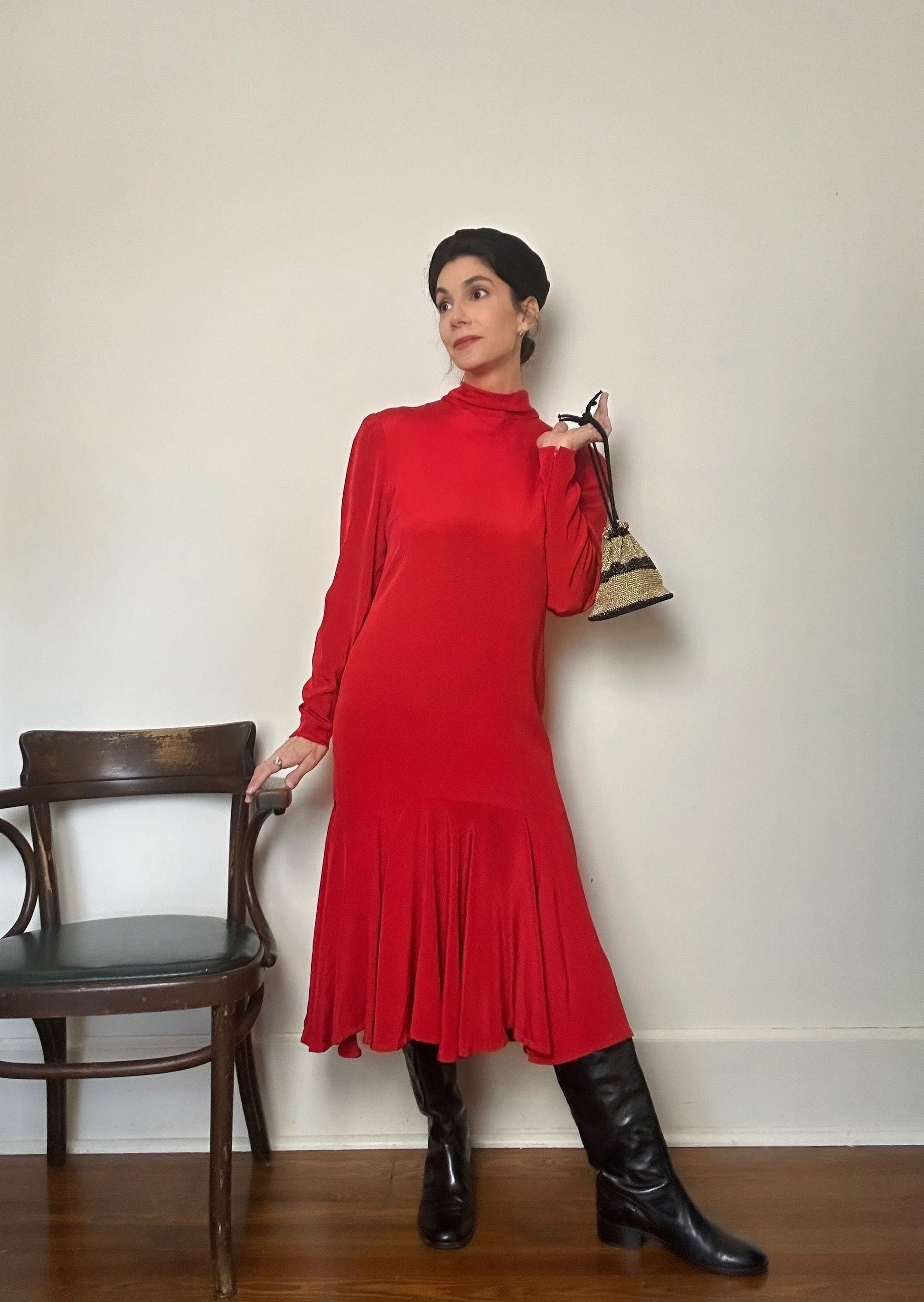 In the most perfect shade of crimson (a true-red), this slinky draped jersey midi-dress by Pauline Trigere for Saks Fifth Avenue lays on the body in the most flattering yet comfortable way. A column shape and midi-length with a flouncy draped bottom, mock neck, and rear metal zip closure. Wrists have zip closure detail as well to highlight your bracelet stack or timepiece. We simply love her.