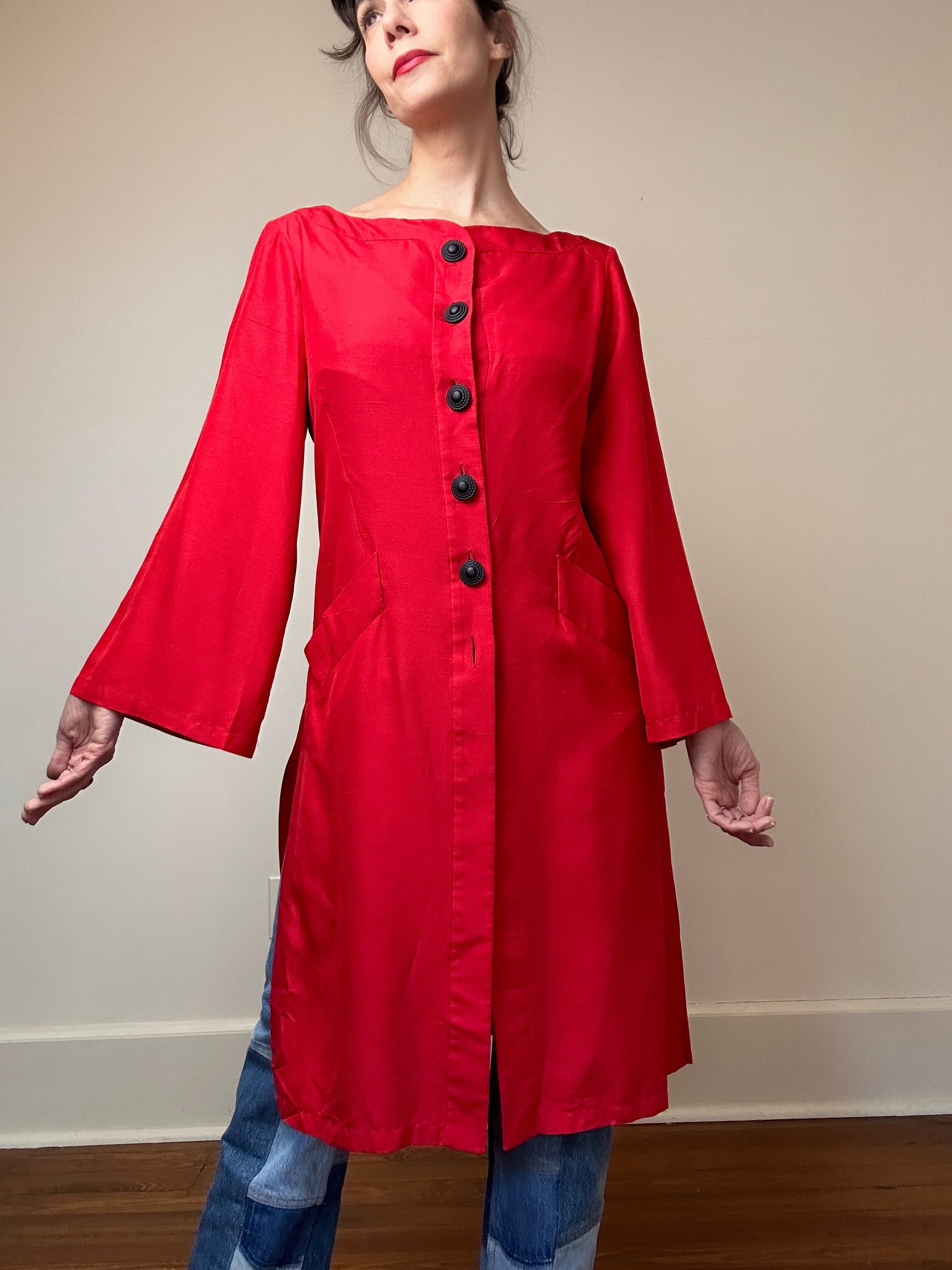 From the iconic 1995 Spring Summer collection by Yves Saint Laurent, this bright cherry red silk tunic blouse can be worn many ways. As pictured on the runway, the black version was was styled as a monochromatic moment with a cigarette pant, sheer tights and heels. We've mixed it up with patchwork denim and a gold heels. Featuring a wide boatneck, two front deep pockets, and six buttons down the front.